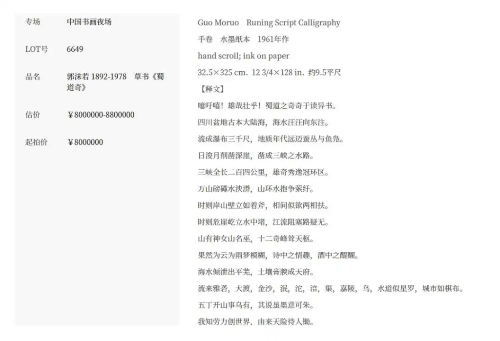 近日,郭沫若书法手卷《蜀道奇》将亮相北京保利二十周年秋拍,12日开拍,起拍万元。其女郭庶英委托律师发布声明,称该作品为父年题赠自己的私藏,从未转让或授权,目前已遗失并报警,质疑拍卖为无权处分,要求保利中止拍卖、返还作品。